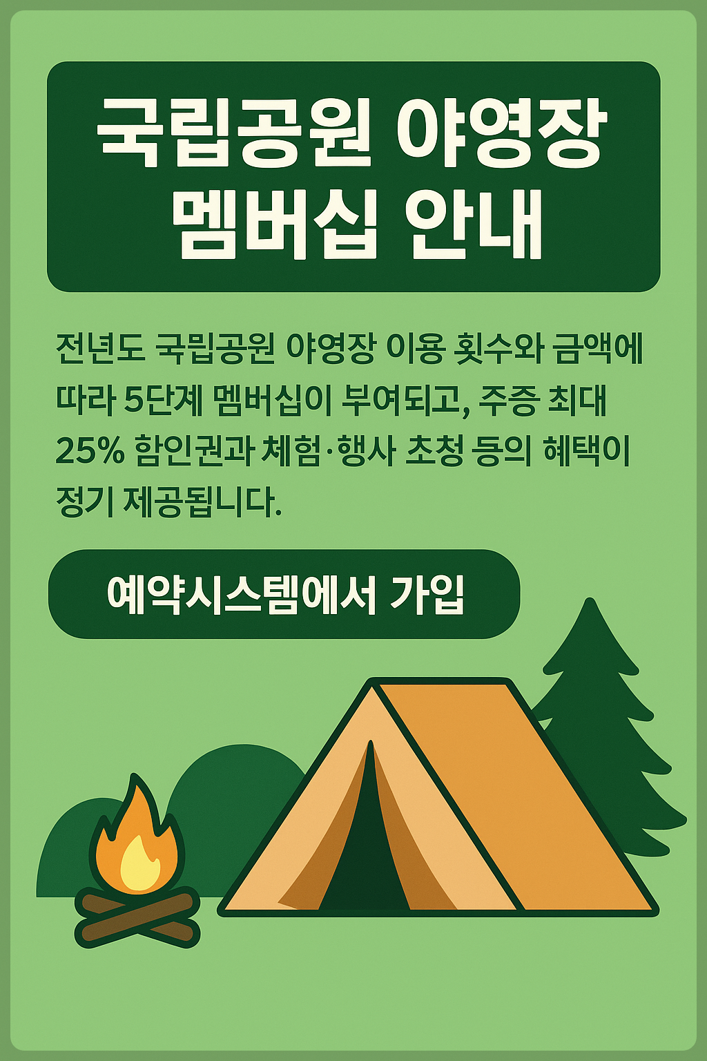 국립공원 야영장 멤버십은 반복 방문 이용자에게 실질적 혜택을 제공하여 주중 이용을 활성화하고 공원 프로그램 참여를 촉진하는 제도입니다.