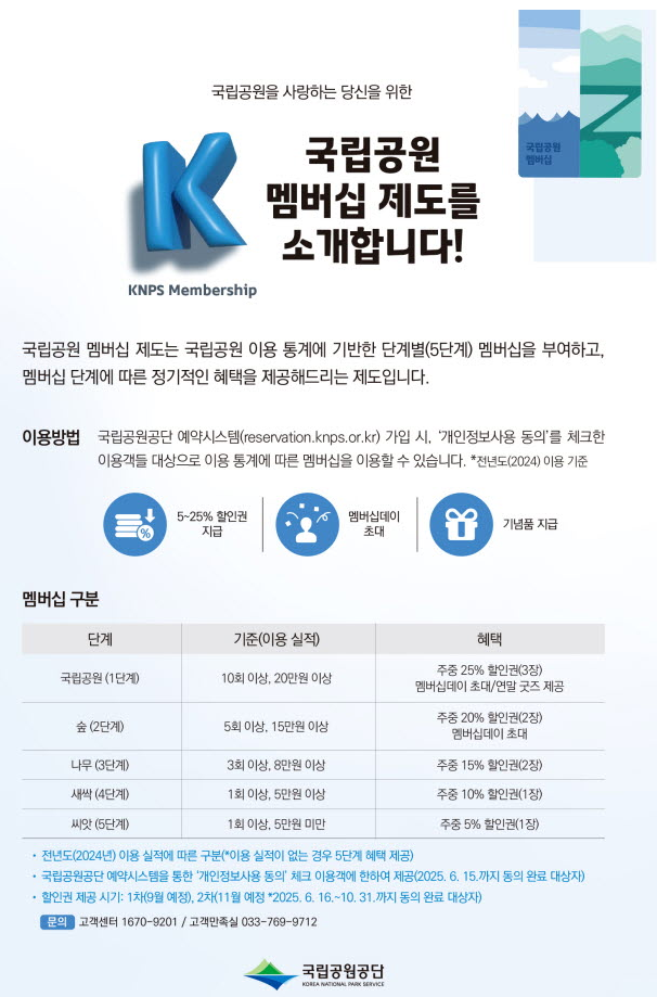 국립공원 야영장 멤버십 제도는 2025년 9월1일 부터 도입된 제도로, 국립공원 예약시스템 이용 실적(전년도 이용 횟수 및 결제금액)을 바탕으로 등급을 산정하고 등급별 혜택을 제공하는 프로그램입니다.