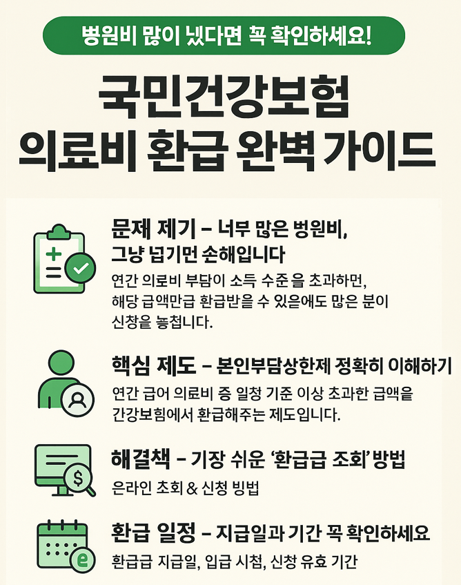 의료비 환급은 연간 본인부담 의료비가 일정 한도를 넘어설 때 국민건강보험에서 초과분을 돌려주는 제도입니다.