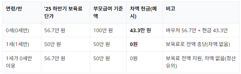 어린이집을 이용하면 '보육료 바우처'가 우선 지원되고, 남는 금액이 차액 현금으로 부모에게 들어옵니다.
