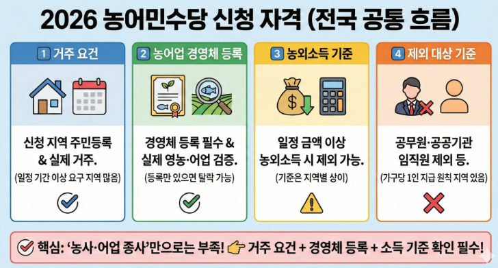 특히 농업경영체 등록 여부는 반드시 확인하세요. 미등록 상태면 지급 대상에서 제외될 수 있습니다.